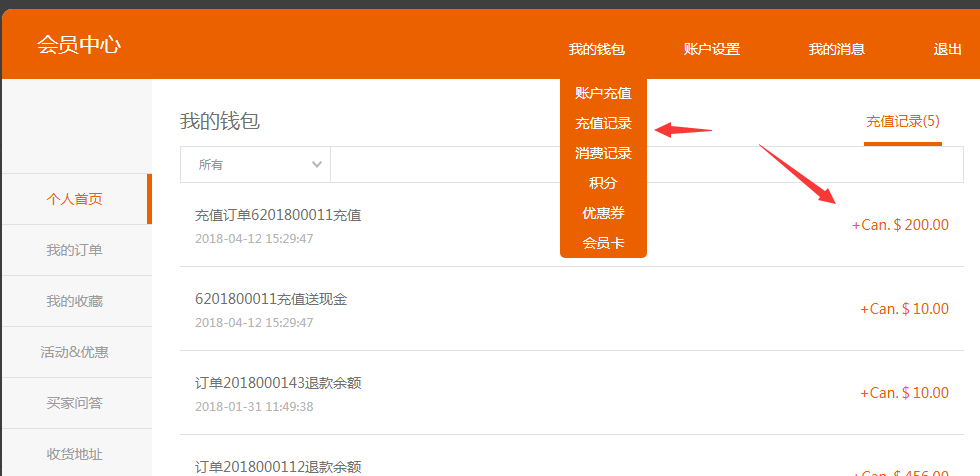③.开启之后,前台会员才可以看到充值入口。以pc为例,进入会员中心---我的钱包增加了账户充值和充值记录